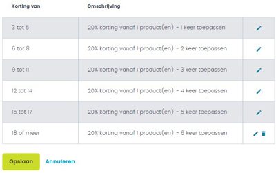 | Korting actief vanaf | Korting geven vanaf | Type | Kortingswaarde | Max aantal keren toepassen |